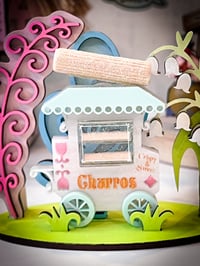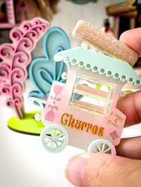Hand assembled/painted/sculpted acrylic miniature churro cart brooch is backed with a magnet fastener. This brooch is approximately 3 inches tall and fits the scale of my peg dolls and buildings. Stand sold separately. The stand, dolls, and other pieces in the photos are not included.