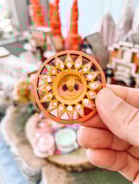 Small World inspired wooden sun brooch is hand painted and hand built by Nikole Adelle. This brooch is approximately 2 inches wide and backed by a magnet fastener. This design is inspired by the Mexican and South American vignette of the Disneyland attraction, "It's a Small World." The small metal stand is included. All other pieces in photos are not included.